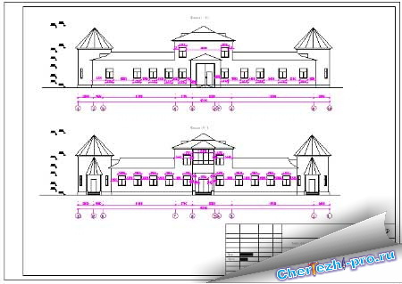 Здание имеет размеры в плане в осях 40,100х24,250м. Высота этажей 3.0м. Общая высота здания от поверхности земли до верха конька — 10.0м. 1. Площадь застройки — 580.29м3 2. Общая площадь помещений- 1079.76м2 3. Строительный объем — 5874.56м3 |