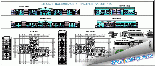 Детское дошкольное учреждение на 200 мест 1 лист размером 18200х42400 Чертежи: планы 1-го и 2-го этажей, 4-е фасада, архитектурные разрезы 1-1 и 2-2, узлы, экспликация помещений, генплан участка |