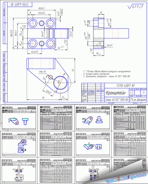 | Комлект документов технологического процесса механической обработки детали 7370-4007-10 Кронштеин. Чертеж заготовки, рабочий чертеж детали | |