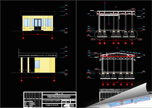 Планы, разрезы, фасады автобусной остановки с небольшим магазином, фундаменты столбчатые, несущая конструкция металлический скелет, ограждающие конструкции бетонные панели |