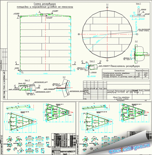 Чертежи марки «КМД» на резервуар V=1000 м3 для нефти и нефтепродуктов, холодной и горячей воды. Варианты резервуара с щитовой и конической кровлей |