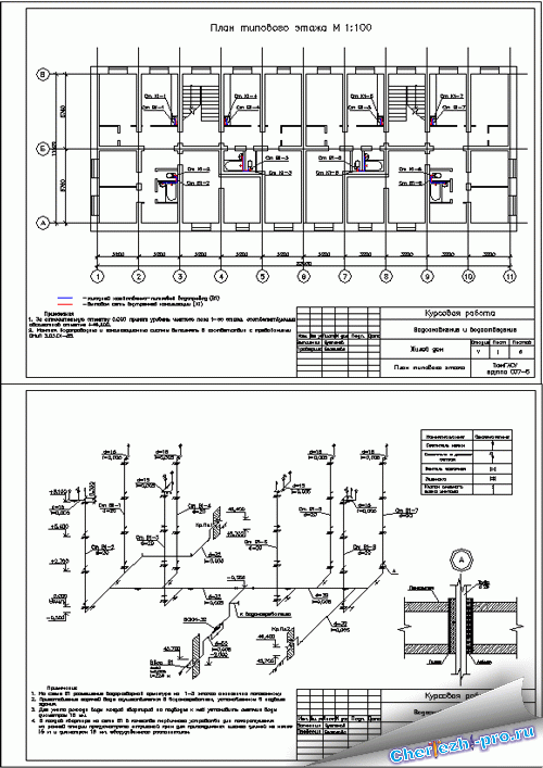 Курсовой проект по дисциплине Водоснабжение и водоотведение.В пакете пояснительная записка и чертежи. План типового этажа, план подвала, аксонометрические схемы В1 и К1, профиль дворовой сети, генплан, спецификация |