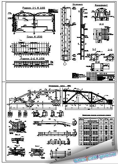 На чертежах представлено производственное здание, с шагом двухветьевых колонн 12м., двумя пролетами по 21м.,общей длиной 180м. Чертежи содержат план здания (1:500), разрезы продольный (1:500) и поперечный (1:100), колонну, фундамент, ферму (1:50), узлы и схемы армирования. |