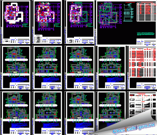 Жилой 2-х этажный коттедж с подвалом и гаражом на 2 машины. Есть планы, фасады, спецификации, а также архитектурные узлы. Четыре варианта отделки фасадов. 24 листа. |
