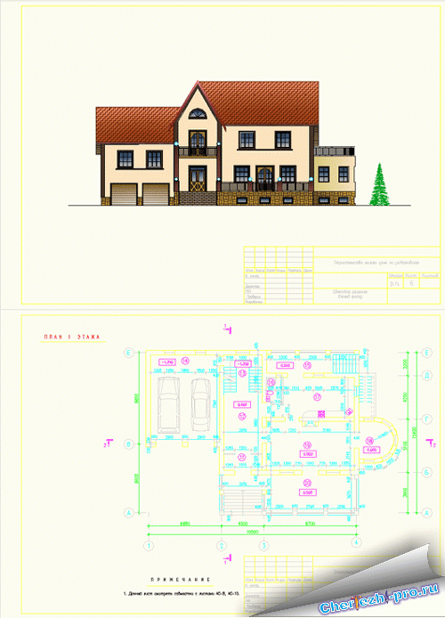 Архитектурная часть проекта жилого одноквартирного дома. Домдвух этажный с подвалом, сблокированный с гаражом на два автомобиля. |